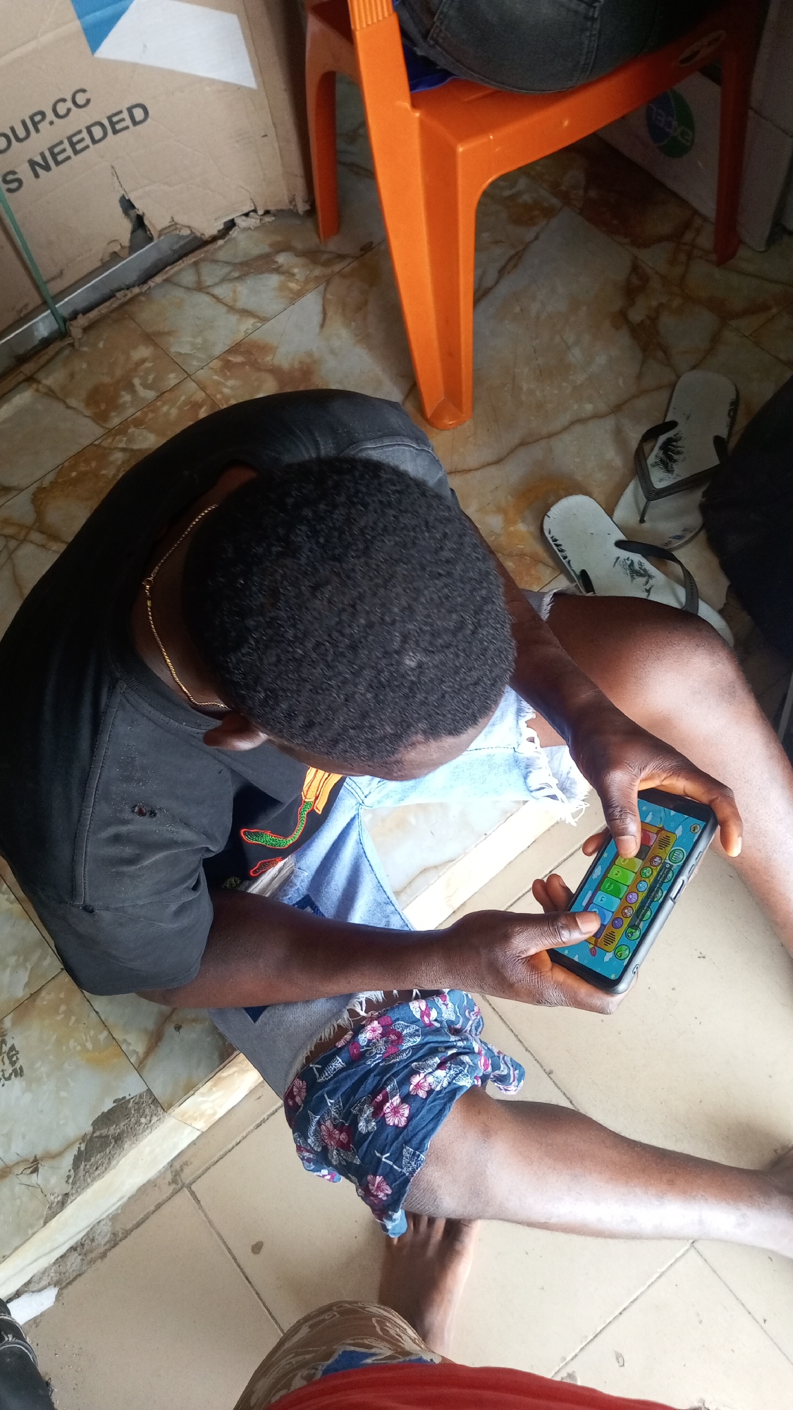 An overhead view captures an indoor scene in Nkpor, Nigeria. A dark-skinned individual, presumably male, with short, dark, textured hair, is seated on a tiled floor. This individual wears a black t-shirt, exhibiting a small tear on the left side, and light-colored distressed shorts with a blue floral fabric tied around the right upper thigh. A thin gold-colored chain is visible around their neck. The individual actively holds a black smartphone horizontally with both hands, thumbs positioned over the screen, which displays a colorful grid-based game or application. To the right of the seated individual, a pair of white flip-flops with black straps rests on the floor. An orange plastic chair is partially visible in the upper right quadrant, with the lower legs of a second individual, dressed in dark trousers, seated upon it. In the upper left quadrant, a large, worn cardboard box is visible, partially obscured, displaying text including "OUP.CC" and "S NEEDED." The floor throughout the visible area consists of light-colored, patterned tiles, showing signs of wear and minor discoloration. In the immediate foreground, the bare foot and lower leg of a third individual, wearing a red garment, are visible, suggesting their proximity to the scene.