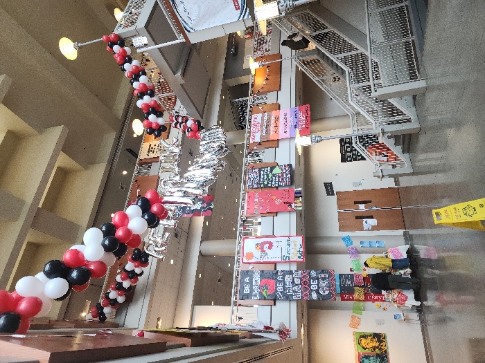 The image displays the multi-level atrium of the Seattle University Student Center in Seattle, Washington, USA. A long garland of red, white, and black balloons is strung across the upper sections of the atrium, with silver foil balloon letters spelling "RED HAWK" or a similar phrase beneath them. Various rectangular banners hang from the second-floor railing, displaying text such as "BE A RED HAWK", "HOMECOMING WEEK", and "Sustainable Student...". On the ground floor, two white-clothed tables are set up to the left. Two individuals are present at these tables: one wearing a dark jacket and a red beanie, and another in a yellow jacket, both focused on the table's contents. To the far left, a colorful art piece featuring two stylized faces is mounted on the wall. A yellow "WET FLOOR" caution sign is visible on the polished light-colored floor in the foreground. On the right, a multi-flight staircase with white metal railings leads to upper levels. A single individual in dark clothing is observed ascending this staircase. Double wooden doors are located behind the tables. The ceiling features a coffered design with visible beams.