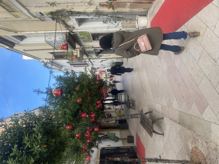 The image depicts a pedestrian street in Brindisi, Italy, under a clear blue sky. The street is paved with light-toned rectangular and square tiles, featuring a diagonal pattern of lighter and subtle reddish hues. A prominent red carpet extends along the right side of the street, commencing near the foreground figure and continuing into the midground. A smaller red mat is visible on the left side near a building entrance. Buildings with light-colored facades, multiple stories, and traditional European architectural elements, including windows with shutters and balconies with ornate railings, line both sides of the thoroughfare. A row of green-leafed trees with slender trunks runs down the left side of the street. These trees are heavily adorned with numerous bright red spherical ornaments and wrapped with string lights. Red bell-shaped ornaments are suspended from strings strung across the street between buildings and are also visible hanging from the trees. In the foreground, a person is observed from behind, walking away from the camera, slightly to the right of center. This individual has dark, curly hair and wears a dark olive-green hooded parka, blue jeans, and light brown boots. They carry a light pink shoulder bag with a gold-colored clasp on their right side. Further down the street, several other individuals are walking away from the camera. At least three male-presenting figures are distinguishable, two wearing dark coats or suits and one in a lighter jacket. Along the left side of the street, beneath the decorated trees, two wooden benches with dark metal supports are present. A large wooden barrel is positioned near one of these benches. On the right side, white potted plants are placed outside building entrances, and a festive, deer-like decoration is partially visible. Signs for businesses are visible on building facades, including one with a "UN" logo and another appearing to say "Olio." The scene suggests a holiday or festive period due to the specific decorations.
