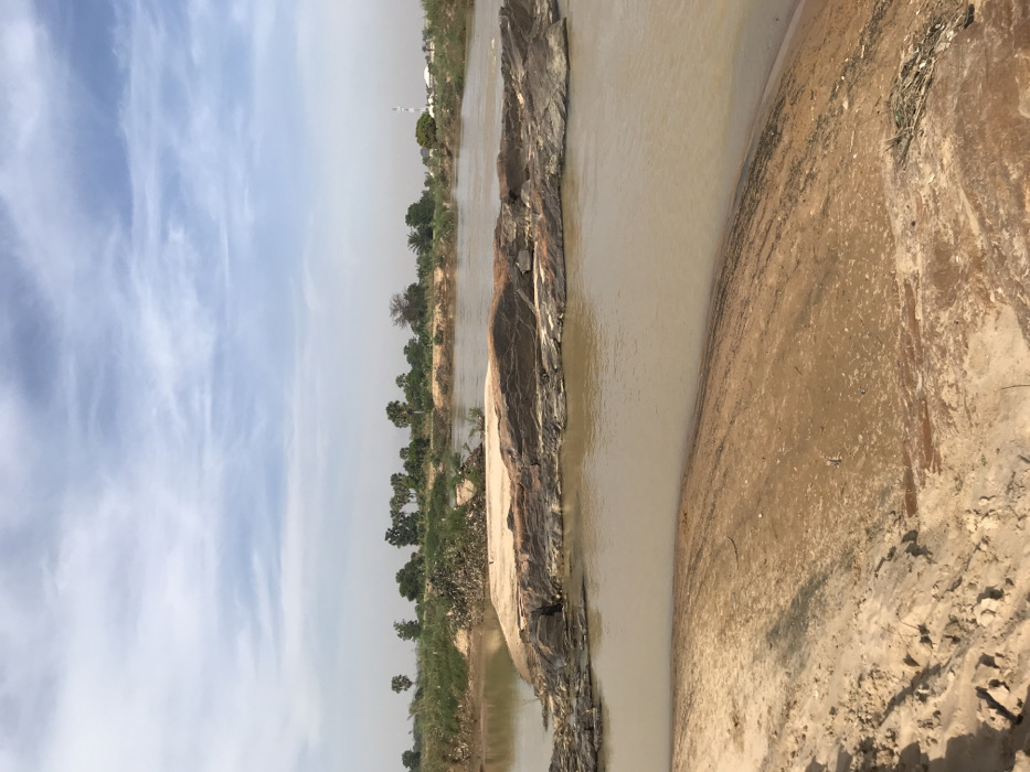 The image presents a wide, brownish-tan river under a partly cloudy sky, characteristic of Narayi, Nigeria