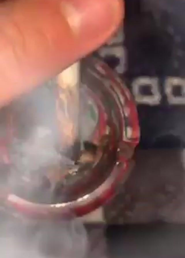 A hand is seen tapping the lit end of a marijuana cigarette into a glass ashtray containing ash and discarded roaches
