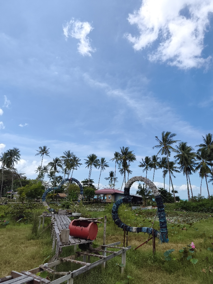 - "A serene landscape showcases a wooden walkway with a rusted red barrel leading to heart-shaped structures, all set against a backdrop of tall palm trees" by FM-H4hzl2, licensed under CC BY 4.0