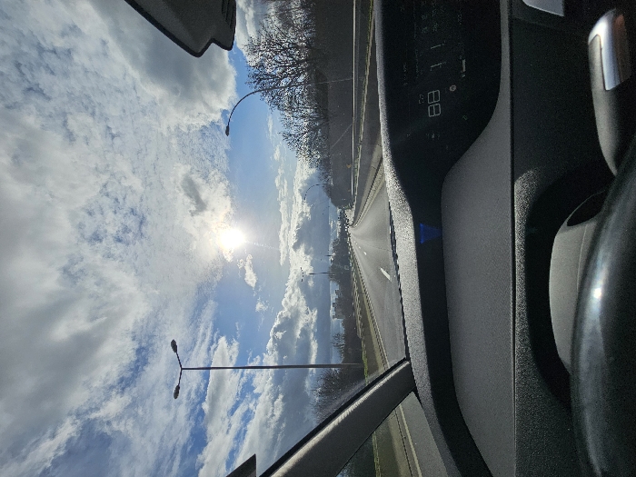 Inside a car on a sunny day, a view shows the road ahead, stretching into the distance under a bright sky filled with scattered clouds. Streetlights line the side of the road. The car's dashboard and steering wheel are visible, obscuring part of the view. The sun shines brightly, creating a sense of forward movement and open space.