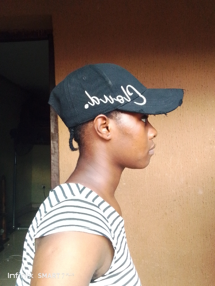 A young woman in profile wears a black baseball cap with white lettering and a striped white and black shirt. She stands against a textured brown wall. Her skin is brown and her hair is short, with a small braid visible behind her ear. The cap is slightly distressed at the brim. A partially visible doorway appears to the left. "Infinix SMART 7 plus" is faintly visible in the lower left corner.