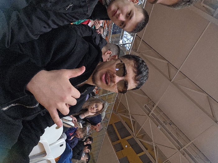 The image depicts a group of individuals seated in the spectator section of an indoor arena or sports hall located in the city of Panagyurishte, Bulgaria. In the immediate foreground, to the left, the upper portion of a male's head and the left side of his face are visible, partially cropped from the frame. To his right, a young male with short dark hair and a clean-shaven face looks directly towards the camera. He wears a dark jacket. Adjacent to him, positioned centrally, is a young male with short, textured dark hair and light facial hair. He wears dark sunglasses and a black zippered hoodie, looking towards the camera with his mouth slightly ajar. His right hand is raised, performing a "shaka" or "hang loose" gesture (thumb and pinky extended, middle fingers folded). Behind these individuals, several other people are seated in white plastic stadium-style chairs. A young female with long, dark hair and glasses is visible in the mid-ground to the right, looking towards the camera with her chin resting on her left hand. Further in the background, additional individuals, mostly young adults, are seated casually. One person in the mid-ground is observed holding a white smartphone. The environment features a high, light-colored ceiling with exposed structural beams and trusses characteristic of a large indoor facility. A section of a yellow-colored wall or upper viewing area is visible in the background. The lighting appears consistent with an indoor public venue.