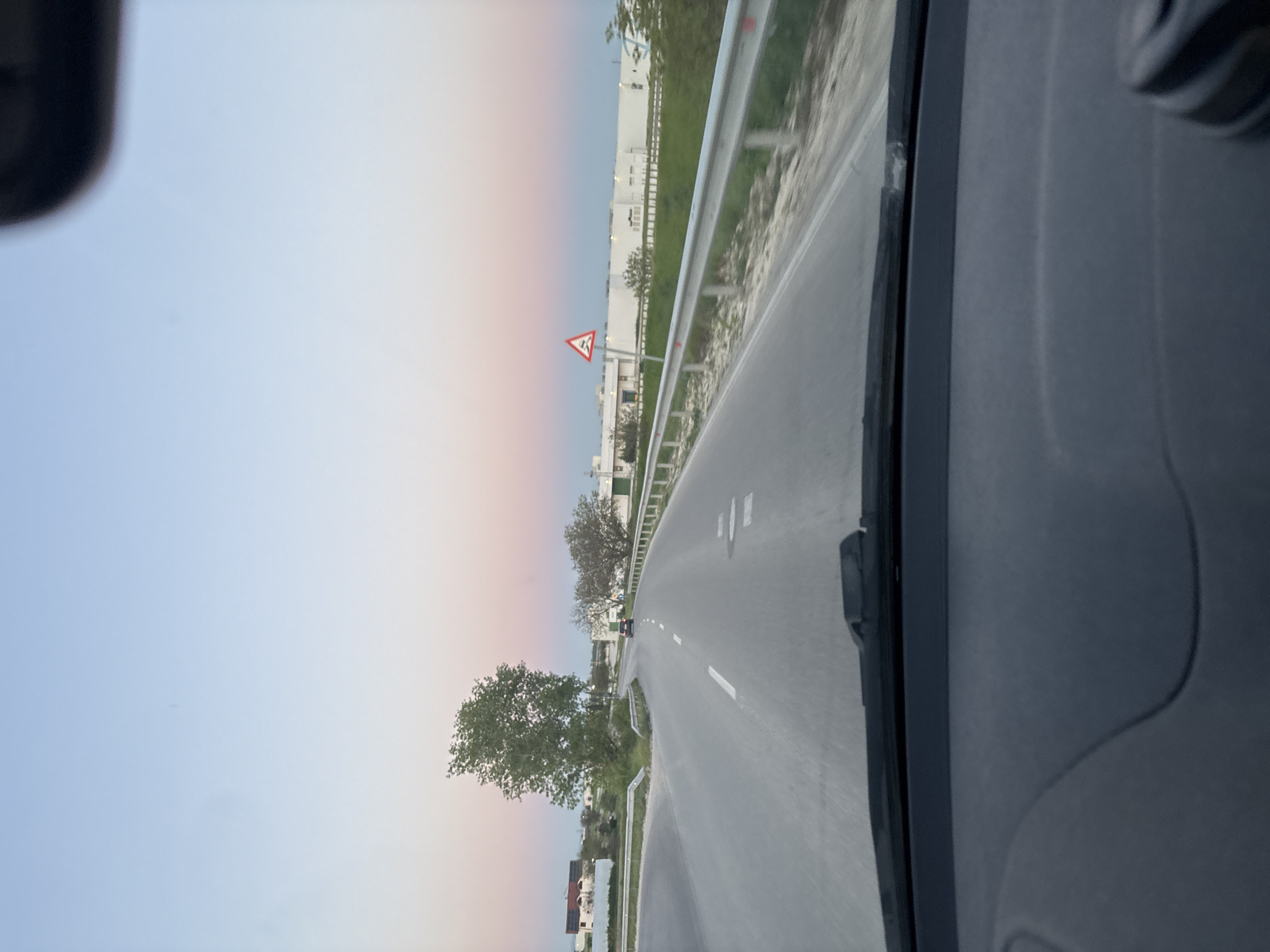 The image depicts a view from inside a vehicle driving on a road in Skutare, Bulgaria. The road is paved and has white lane markings. A metal guardrail runs along the right side of the road. Buildings are visible in the background. A pedestrian crossing sign is displayed. A partial rainbow is seen. The sky is pale blue and pink. The interior of the vehicle is visible on the right.