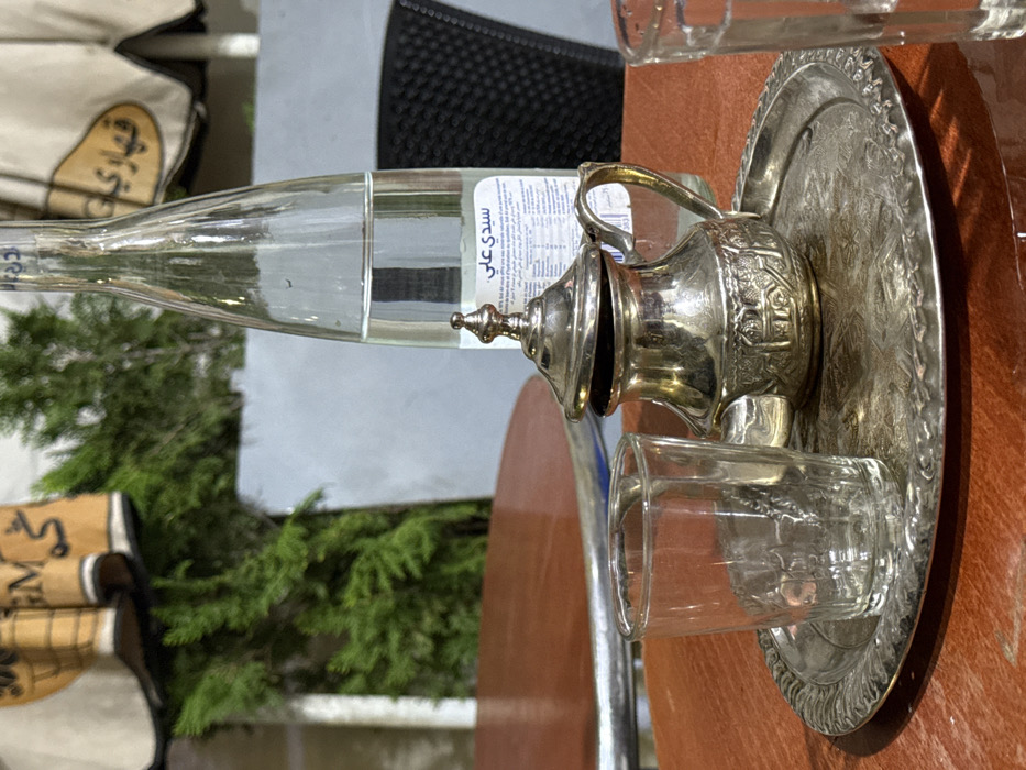 A silver teapot rests on an ornate silver tray with a glass. A partially visible glass bottle of Sidi Ali water is near the teapot. The setting appears to be outdoors with foliage and a white cloth visible in the background. The table or surface is a warm brown color. The image is taken from an unusual angle, possibly rotating the subject.