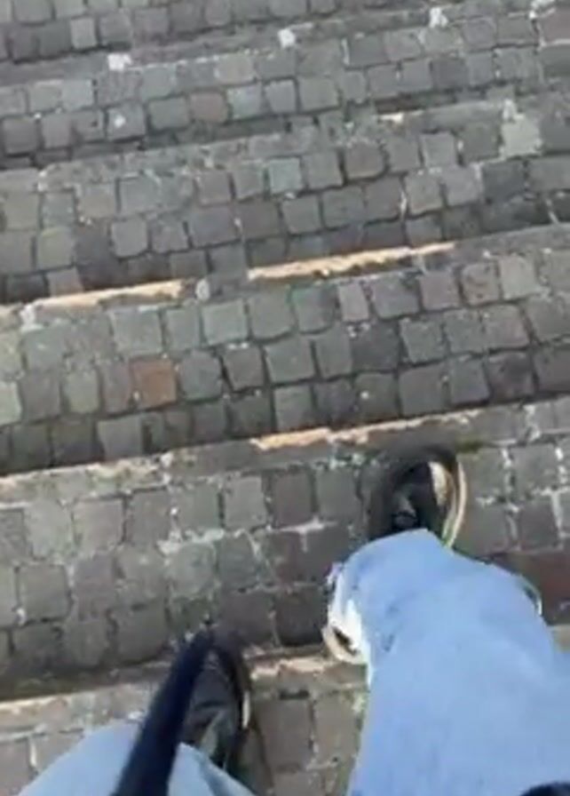 first-person perspective of someone walking down a set of stone stairs. The person is wearing blue pants and black shoes. As they descend, the camera pans up to reveal a view of a parking lot with several cars, a roundabout, and a backdrop of hills and a cloudy sky. The shadows of the person and another individual are also visible on the steps.