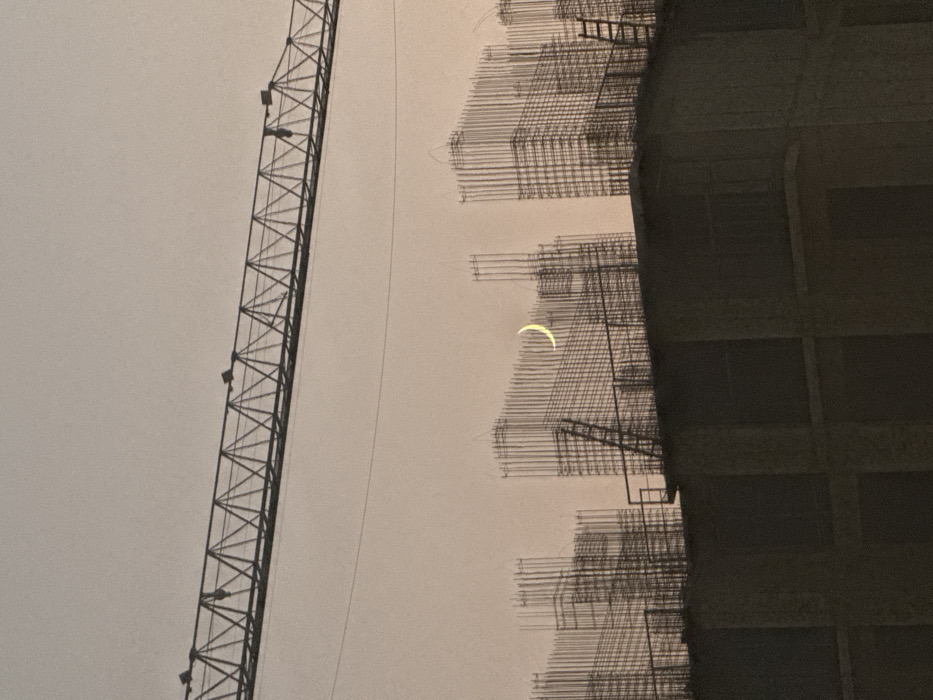 This image depicts a construction site in Yerevan, Armenia, during either twilight or dawn. The foreground is dominated by the upper levels of a multi-story building under construction, characterized by exposed concrete structural elements and numerous vertical steel rebar columns extending upwards from the completed floors, forming the skeletal framework for future levels. Two dark, diagonal ladders are visible leaning against these rebar structures on the building's upper facade. Above the construction, the horizontal lattice boom of a tower crane extends across the upper portion of the frame, showing its intricate metalwork. A thin, bright crescent moon is visible in the sky, positioned approximately above the center-right of the rebar structures. The sky has a uniform, pale peach or light orange tint. A thin horizontal wire runs across the middle ground, beneath the crane boom. No individuals are visible in the scene.