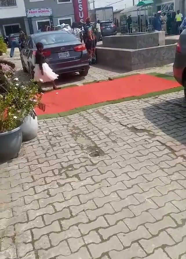 paved parking area outside a building labeled "VADIT SCHOOL" with a sign that says "JESUS" in red letters. Several cars are parked, including a dark gray Kia sedan and a dark SUV. A red carpet leads from the building towards the parking area. People are standing and walking around near the building. Some are wearing patterned clothing. Potted plants with flowers are visible near the camera. The pavement appears to be wet or damp. In the background, a white truck is visible, along with more people and structures that appear to be stalls or small shops. The video is taken from a stationary position at ground level.