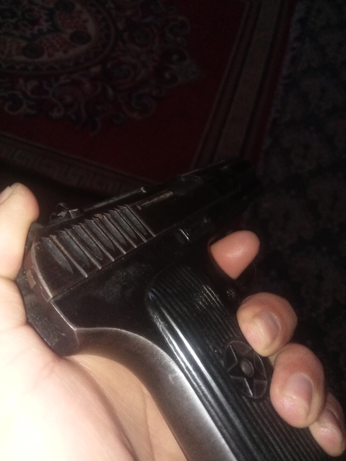 A human hand is holding a black Tokarev TT-33 style semi-automatic pistol