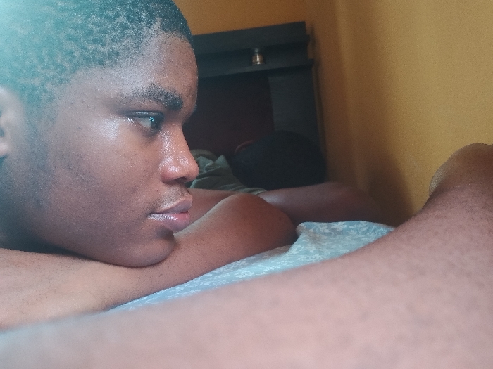The image depicts an indoor scene in Mgbuoshimini, Nigeria, likely a bedroom. In the foreground, a young individual with dark skin and short, dark, textured hair is visible in profile, facing right. Their head is propped on their forearms, which rest on a light blue patterned sheet. The individual's eyes are open, and their expression appears contemplative or pensive. Their face exhibits a slight sheen, possibly from sweat or oil. To the left of this individual's face, the top of their bare shoulder is visible. In the mid-ground, behind the primary subject, another individual with dark skin and dark hair is partially visible, lying face down or away on the same or an adjacent surface covered by the light blue patterned sheet. Behind them, a dark brown or black wooden headboard or piece of furniture with a light-colored knob or accent is present. The background consists of a plain mustard yellow wall. No direct interaction is observed between the two individuals.