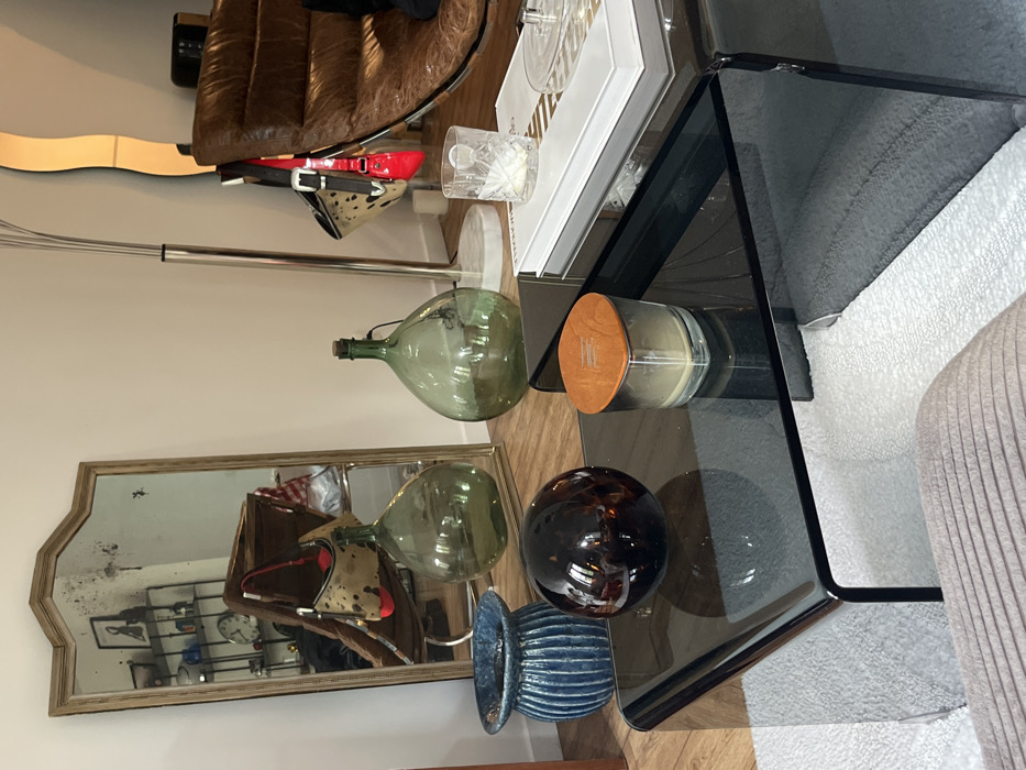 This image depicts an interior scene in Roubaix, France, featuring an arrangement of furniture and decorative items within what appears to be a living space. In the foreground, a rectangular coffee table made of dark, smoked bent glass rests on a light-colored, shaggy rug. On the table, from left to right, are a dark amber glass sphere, a glass jar candle with a round wooden lid, a stack of white hardcover books, and a clear, cut-glass tumbler. Behind the coffee table, a ribbed, blue ceramic vessel is positioned on the wooden floor. To its right, a large, rectangular floor mirror with a distressed, light-colored frame stands vertically. The mirror reflects a background area containing a shelving unit with various items, including a clock and other objects. A spotted handbag with a red strap and a chair are also visible in the mirror's reflection. Two large, bulbous green glass demijohns are placed on the wooden floor, positioned between the mirror and a modern floor lamp. The lamp features a chrome-finished slender stand with a cluster of thin rods at its apex and a circular white marble base. To the far right, a portion of a brown leather lounge chair with a visible metal frame is seen, from which a spotted handbag with a red strap is hanging. The walls are a plain, light color. The floor is made of wood, and a light-colored rug covers part of the foreground. No individuals are present in the scene.