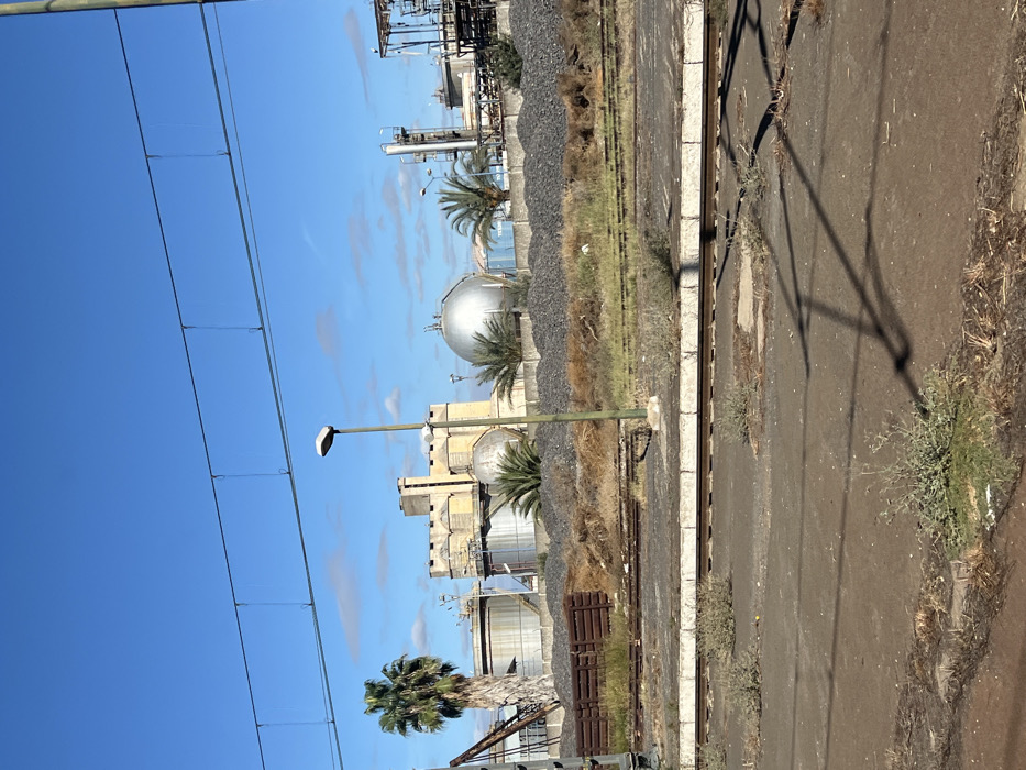This image depicts an industrial landscape adjacent to a railway line in Sidi Kacem, Morocco, under a clear blue sky with scattered white clouds. In the foreground, multiple railway tracks with concrete ties are visible, appearing unused due to sparse weeds and dry vegetation growing between and around them. A distinct pattern of shadows, cast by an unseen overhead structure or wires, stretches across the tracks and ground. The midground features a low, concrete railway platform running parallel to the tracks. A slender, olive-green utility pole with a light fixture at its apex stands on this platform. Beyond the platform, the ground rises slightly, covered in dry vegetation and several large piles of dark, granular material, possibly coal or aggregate. The background is dominated by an industrial complex. Prominent features include several large, metallic cylindrical storage tanks and two spherical storage tanks, one notably larger and reflective. Behind these tanks, a multi-story, light-colored industrial building with crenellated architectural details, resembling a castle or fort, stands centrally. To the right, additional industrial structures, including towers, piping, and scaffolding, are visible. Several palm trees of varying heights are interspersed throughout the industrial area. No individuals or active movements are discernible within the scene. The lighting suggests bright daylight.