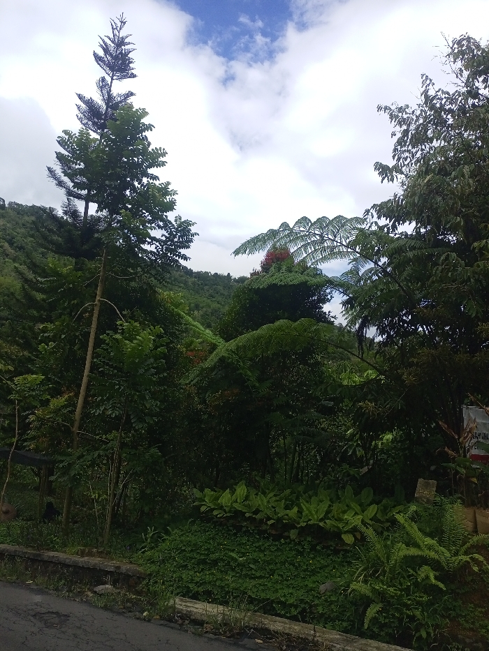 The image displays a lush, green, hilly landscape in Meyong, India, under a partly cloudy sky. In the foreground, a dark asphalt road with minor cracking is visible, bordered by a concrete curb. Immediately beyond the curb, an embankment is densely covered with low-lying green groundcover, transitioning to a section of larger-leafed plants and a cluster of ferns on the right. The mid-ground features thick vegetation, including a tall, slender tree with sparse, dark foliage at its apex on the left, adjacent to a broad-leafed tree. A large fern with prominent horizontal fronds extends across the mid-right, partially obscuring a tree with reddish foliage behind it. On the far right, a partially visible white banner with red text is discernible amidst the foliage. On the far left, beneath a dark tarp, an indistinct dark figure or object is present. The background consists of steeply rising hills completely covered in dense green trees. The sky above is a mix of white clouds and patches of blue.