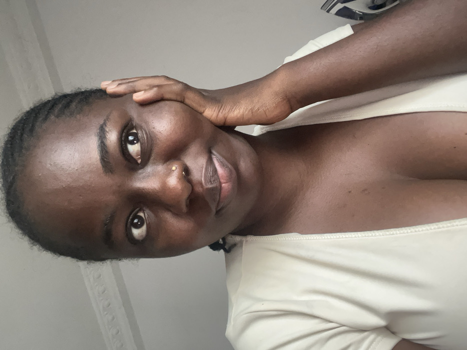 A front-facing, medium close-up photograph captures an individual of dark complexion in Iranla, Nigeria. The subject has dark hair styled in braids, pulled back from the face. A small gold stud piercing is present on the left nostril. The eyes are wide and directed slightly to the right of the frame, while the lips form a subtle, closed-mouth smile. The individual's left hand rests against their lower left cheek and jawline. They are wearing a light-colored, possibly cream or off-white, open-front garment with short sleeves, revealing a portion of the chest. The background is a plain, light-colored wall, with a white ceiling featuring decorative molding visible in the upper left quadrant. A reflective object is partially visible along the far right edge of the frame. The lighting is soft and consistent throughout the scene.