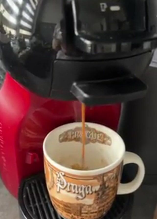 A red and black pod coffee maker pours steaming coffee into a white ceramic mug emblazoned with "Praga" and a depiction of Prague's cityscape. The coffee stream is thin and dark, and the mug is already partially filled. Reflected in the machine's black casing are window blinds and a person taking the video. The machine sits on a gray countertop.