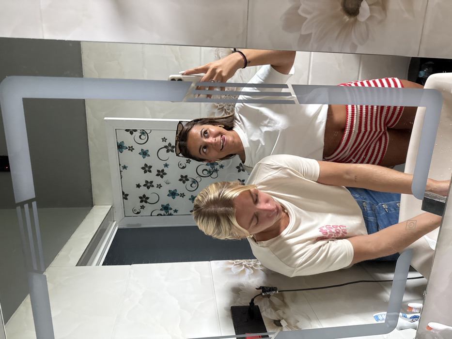 Two women are reflected in a bathroom mirror with a frosted border. One woman with dark hair holds a phone, wearing a white t-shirt and red and white striped shorts. The other woman with blonde hair is angled downward, wearing a beige t-shirt and blue denim overalls. A window with a floral pattern can be seen in the background. A power outlet and sink are visible. The image is rotated, giving a tilted perspective.