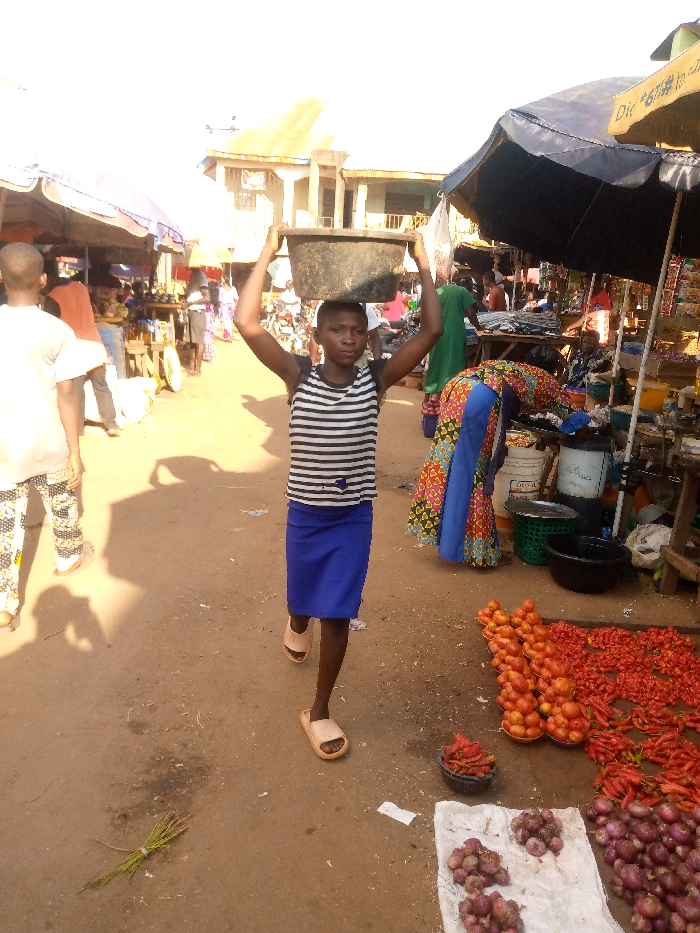 This image depicts an active outdoor market in Akwanga, Nigeria, under bright daylight conditions. A young individual, wearing a black and white horizontal striped sleeveless shirt, a blue knee-length skirt, and light-colored slip-on sandals, walks forward. They are balancing a dark, likely plastic, basin on their head, supported by both hands raised upwards. The ground consists of reddish-brown compacted earth, where distinct shadows are cast by the primary subject. To the right of the foreground, market goods are displayed directly on the ground or on a white cloth, including piles of red tomatoes, numerous small red chili peppers, and clumps of purple onions. A small black bowl containing red peppers is also visible. In the midground, a person wearing a multi-colored patterned dress is bending over, attending to goods beneath a large dark market umbrella. Further into the background, additional market stalls with awnings, other individuals, and multi-story buildings are present, indicating a bustling commercial environment.