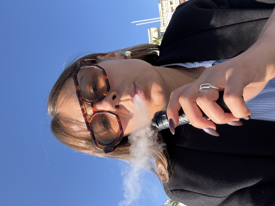 A female subject is depicted in a medium close-up, low-angle shot under a clear blue sky. She has brown hair and wears oversized tortoiseshell-patterned sunglasses with amber-tinted lenses, obscuring her eyes. Her attire includes a black blazer over a light blue pinstriped shirt, a gold-colored hoop earring on her right ear, and a silver-colored ring with small clear stones on her left ring finger. Her nails are manicured with a dark polish. She holds a black, textured vaping device in her left hand and is actively exhaling a prominent plume of white vapor from her mouth. The background features a partial view of a white decorative balustrade on the left and white multi-story buildings with vertical white poles on the right. This architectural context, combined with the clear sky, indicates the scene is located along the Promenade des Anglais in Nice, France.