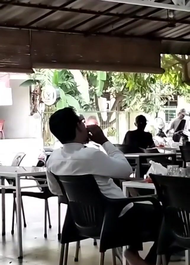 man sitting in a black chair at an outdoor restaurant. He's wearing a white long-sleeved shirt and dark pants, and he is drinking something from a red glass. He leans back in his chair and rests his arms on the armrests, gazing out at the scene beyond. The restaurant has white tables with black chairs. There are other people sitting at tables in the background, and lush greenery is visible outside. The restaurant is covered with a corrugated metal roof.