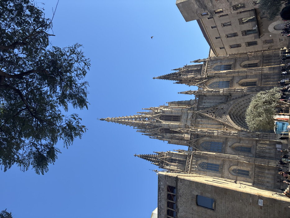 A low-angle, slightly rotated shot features Barcelona Cathedral against a clear blue sky. The cathedral's intricate Gothic spires and facade dominate the view, positioned between a tree with dense foliage to the left, and neighboring stone buildings on the right. People are vaguely seen at the edge of the frame. A small bird flies in the sky.