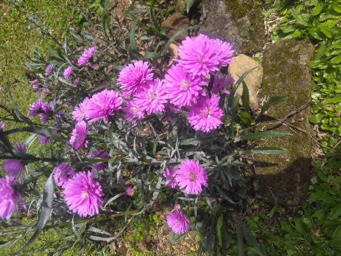 This image presents a detailed view of a flowering plant in a garden setting within Cipanas, Indonesia. The central subject is a cluster of vibrant magenta-purple flowers, consistent with asters, each displaying multiple layered petals and a small yellow central disc. These blossoms are borne on dark, slender stems, accompanied by elongated, narrow, green-grey foliage, some leaves appearing lightly dusted. The base of the plant is situated on exposed brown soil, bordered by several moss-covered stones or rocks. Surrounding the plant, the ground is covered with patches of bright green grass and various low-lying green plants. The scene is illuminated by strong natural light, casting soft shadows. No individuals, animals, or overt human activity are depicted.