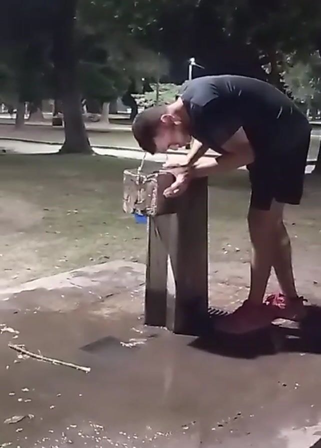 A young man is drinking from a drinking fountain in a park at night. He's wearing a black t-shirt, black shorts, and pink sneakers. The drinking fountain is made of concrete and wood, and the area around it is wet. There are trees and grass visible in the background. The lighting is dim. The man is leaning over the fountain with both hands on it, his mouth around the stream of water. Some of the water spills over him as he drinks.