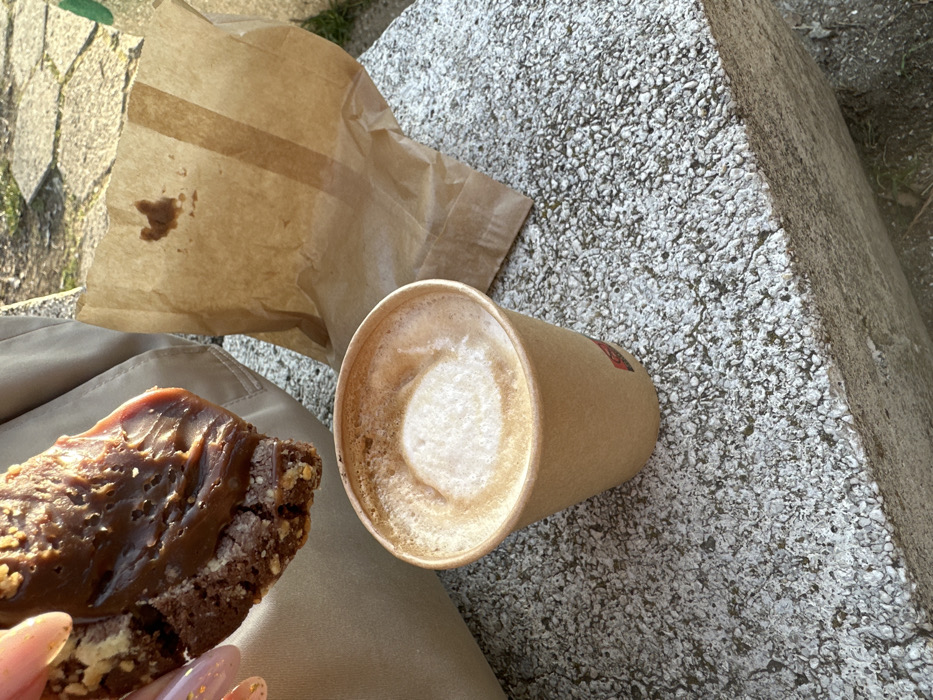A human hand, with fingernails painted in iridescent pink, is holding a dark brown pastry. The pastry features a thick, glossy layer of light brown, likely chocolate or hazelnut, spread on top and visible inclusions of lighter-colored nuts or crumbs within its body. Below the pastry, a disposable, light brown paper cup contains a coffee beverage with a distinct layer of frothed milk, suggesting a latte or cappuccino. A partially visible red logo, consistent with "Costa Coffee," is present on the side of the cup. To the right, a crumpled brown paper bag lies on the surface, exhibiting an irregular dark brown stain, indicative of chocolate or grease residue. All subjects are resting on a coarse, mottled concrete surface, composed of varied shades of grey and white aggregate. The background is softly blurred, showing glimpses of green foliage and lighter-toned ground cover, characteristic of an outdoor public space. The scene is illuminated by natural daylight. This setting is located in an unspecified outdoor public area within the city of Sofia, Bulgaria.