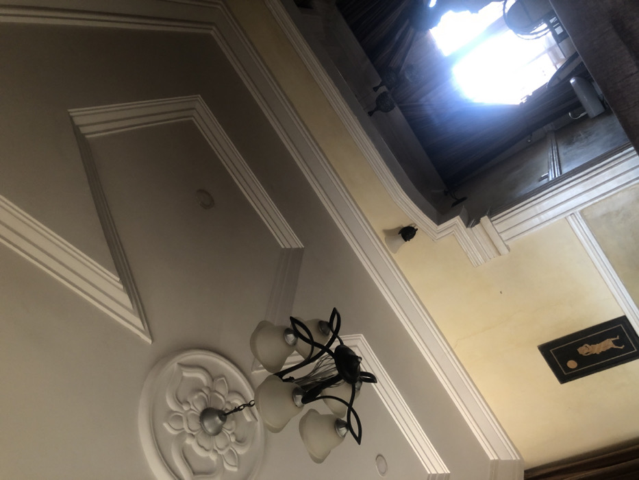 An interior view, tilted diagonally, depicts a well-appointed room in the city of Rido, Nigeria. The white ceiling features extensive decorative crown molding forming geometric patterns and includes a central floral medallion from which a black five-arm chandelier with white opaque shades hangs. Two recessed lights are also visible in the ceiling. The visible wall is light yellow and adorned with a rectangular framed artwork depicting a stylized figure on a dark background. A white wall sconce is mounted above a decorative white archway on the right, which leads to a brightly illuminated area, likely a window, partially obscured by dark curtains. A section of dark upholstered furniture is present in the lower right foreground. No individuals or actions are depicted.