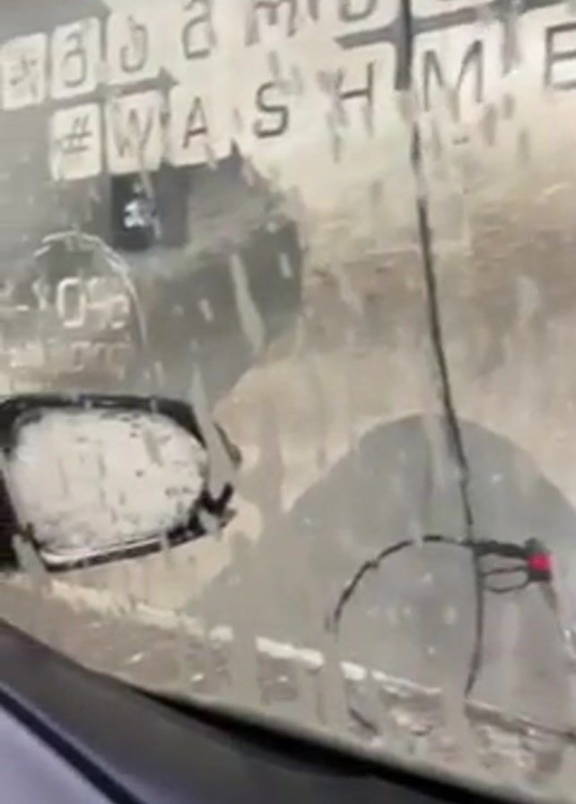From inside a car at a car wash, the video shows soapy water covering the windows with the words "Wash Me" written on the outside of the driver’s side window