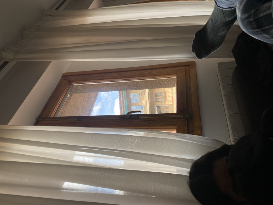 person sitting near a window in a room in Segovia, Spain, at coordinates 40.951, -4.121. The person is wearing a black shirt and black pants, and their right foot is extended with a black sock on it. The window is open, and the curtains are drawn. The person is looking out of the window at a building across the street. The building is yellow with brown trim and has several windows and a balcony. The sky is blue and there are some white clouds visible. The walls of the room are white, and there is a radiator on the wall under the window. The image is taken from a low angle, and the focus is on the person and the window.