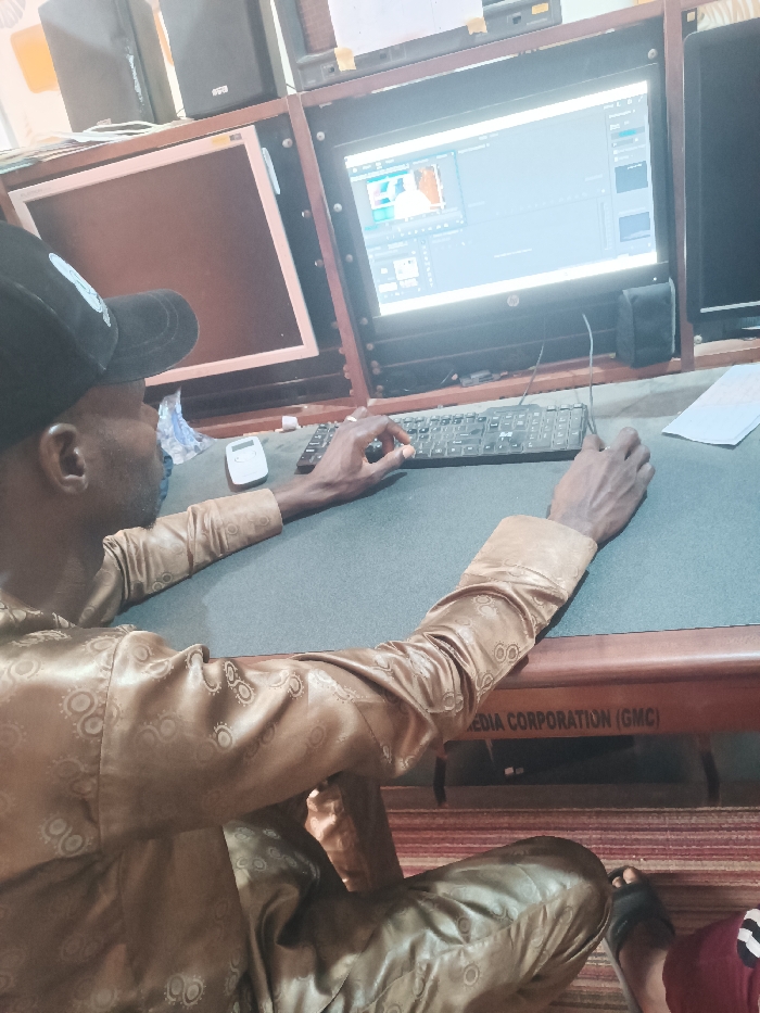 The image depicts an adult male working in a video editing or control room located at a "MEDIA CORPORATION (GMC)" in the city of Unknown, Unknown