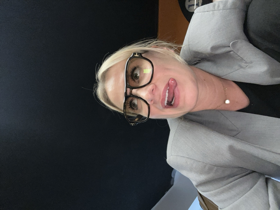 A scene occurring in Saint-Médard-en-Forez, France, depicts an adult Caucasian female with blonde hair, captured from a low angle, displaying her upper torso. She wears a light grey blazer over a dark undergarment and thick-framed dark eyeglasses. A thin necklace featuring a single, spherical, light-colored pendant is visible around her neck. Her mouth is open, with her tongue extended and curled upwards. Her eyes are directed towards the upper right of the frame. A small, rectangular, light-green marking is present on the right lens of her eyeglasses. The background is predominantly dark and featureless, with minor environmental details including a partial light-colored object visible on the left and an indistinct dark orange-brown surface with a white marking on the right.