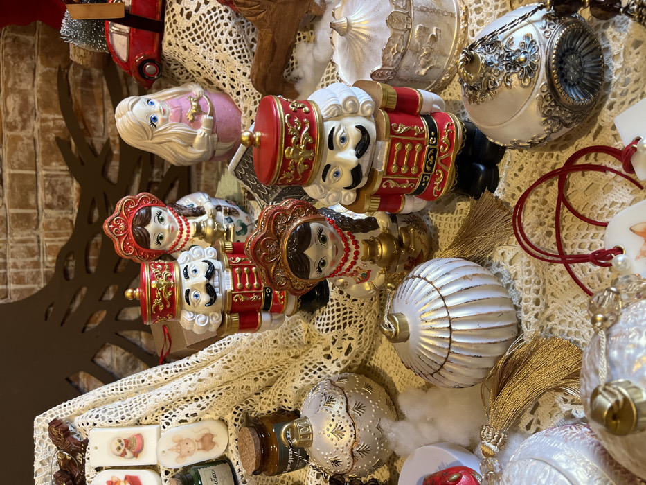 A festive arrangement features nutcrackers and Matryoshka dolls atop a lacy surface