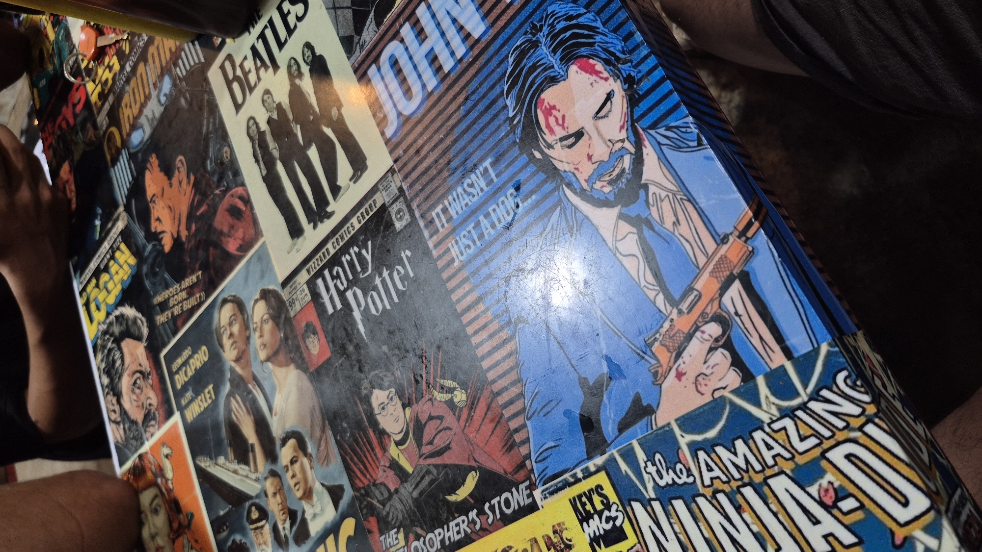 table surface covered in a collage of images from pop culture. There are images of movie posters, including Logan, Titanic, Harry Potter, The Beatles, John Wick and others. The images are tiled together to create a decorative surface. The location is in Tinaquillo, Venezuela, as requested. The perspective of the image is from a slightly elevated angle, looking down on the table. A person is partially visible in the background.