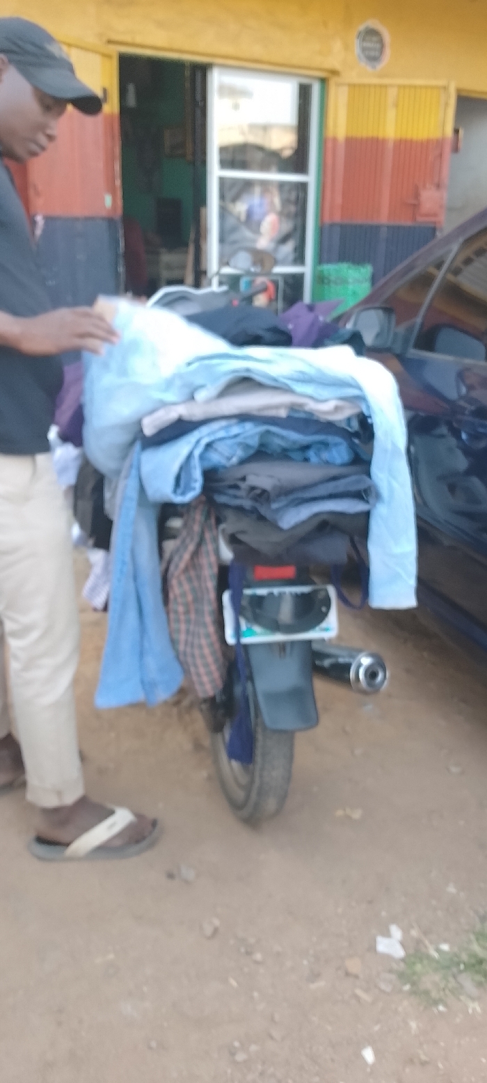 The scene is set outdoors on a dirt surface in the city of Sardauna, Nigeria. A male individual, wearing a black baseball cap, dark t-shirt, khaki-colored pants, and dark flip-flops with white straps, stands on the left side of the frame. He is positioned next to a dark-colored motorcycle, onto the rear of which a large, tall stack of assorted clothing items, including light blue, grey, and patterned fabrics, is loaded. His hands are near the top of this clothing pile. The motorcycle's rear wheel, black fender, a red tail light section, and a silver exhaust pipe are visible. To the right of the motorcycle, a dark blue passenger vehicle is partially visible. In the background, a building displays a yellow upper facade. Below the yellow section, a door or shutter is painted with horizontal stripes of red and dark blue. Adjacent to this is a glass-paneled entrance or window with white framing. A small circular emblem is visible on the yellow facade above the entrance. A green plastic crate is partially visible near the building on the right. The dirt ground contains small stones and sparse debris.