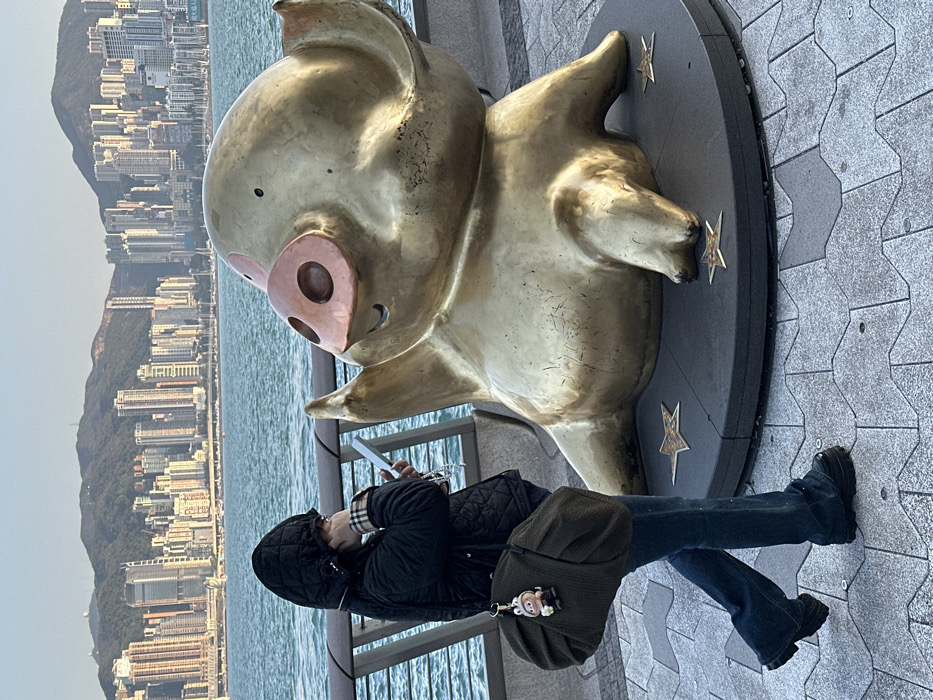 An outdoor scene captures a person walking along the Tsim Sha Tsui Promenade in Hong Kong, China, with Victoria Harbour and the Hong Kong Island skyline in the background. The individual wears a dark quilted hooded jacket with a visible checkered lining, dark blue jeans, and chunky black shoes. They hold a light-colored smartphone in their right hand, appearing to interact with it, while their left hand is near their ear. A dark green, textured shoulder bag with a small character charm hangs from their left shoulder. To the person's right, a large, golden-colored sculpture of a pig-like character, identifiable as McDull, lies on its back with its forelegs raised. The sculpture features a distinct pink snout and is situated on a dark gray circular base. Several small, golden star-shaped plaques are embedded into this base. A metal railing separates the promenade from the turquoise waters of Victoria Harbour. Across the harbor, a dense cityscape of numerous high-rise buildings and skyscrapers is visible, backed by green, tree-covered mountains under a clear sky. The scene is illuminated by natural daylight.