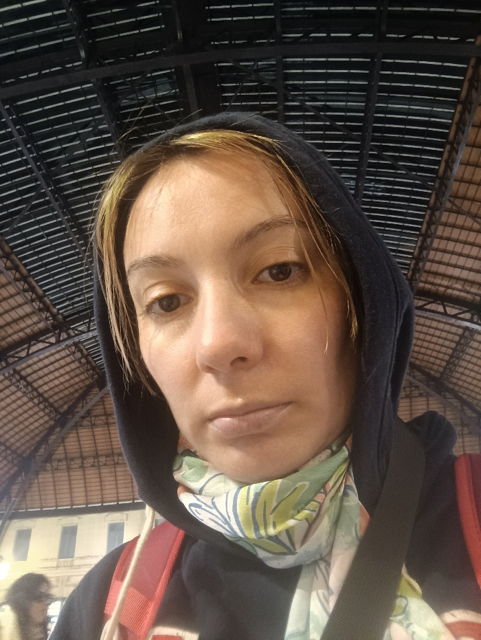 A woman wearing a navy hoodie and patterned scarf takes a selfie. The lighting is diffused. She is indoors, possibly at a train station, judging by the arched ceiling structure visible in the background. The woman has light brown hair and fair skin. A red backpack strap and a black shoulder strap are visible. A building with windows is vaguely discernible in the background.