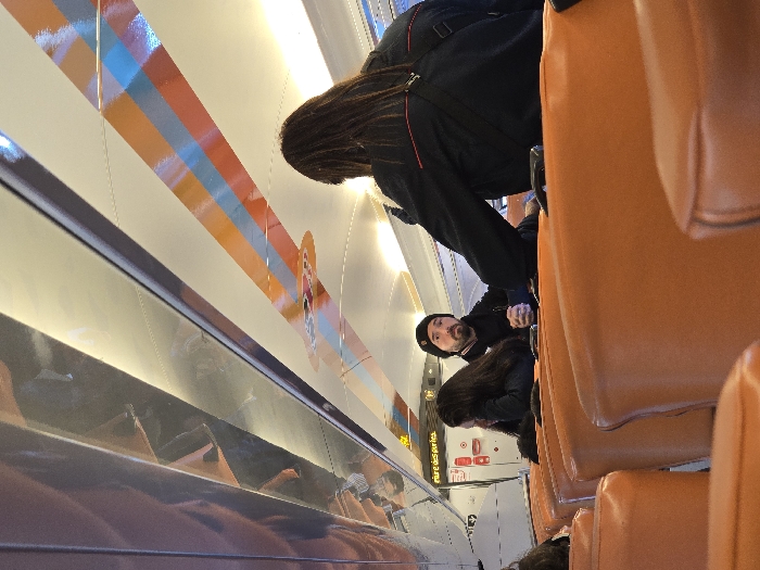 The image captures the interior of a public transport vehicle, identified as being in Cap-d'Ail, France. The perspective is from a lower vantage point within the passenger cabin, looking forward. Numerous orange, upholstered seats are arranged in rows, occupying the foreground and mid-ground. Three individuals are visible in the mid-ground. On the right side, a person with long, dark hair is seated with their back to the viewer, wearing a black jacket accented with red trim on the shoulders and a dark shoulder strap. To their left, a male subject with a beard and mustache is seated, wearing a black beanie and a dark jacket; he is looking directly towards the camera/viewer, with his hands clasped in front of him. Immediately to the left of the male, another individual with long, dark hair is seated, resting their head on their hand. The ceiling of the vehicle is white, featuring prominent horizontal striped patterns in orange, light blue, and a darker blue/purple. These stripes are interspersed with reflective, possibly metallic, panels. Integrated overhead lighting fixtures provide illumination. On the upper left side of the cabin, a white sign with black text clearly reads "Zone des départs" (Departure Zone), with a red circular symbol positioned directly below the text. The overall scene depicts passengers in a train or tram environment.