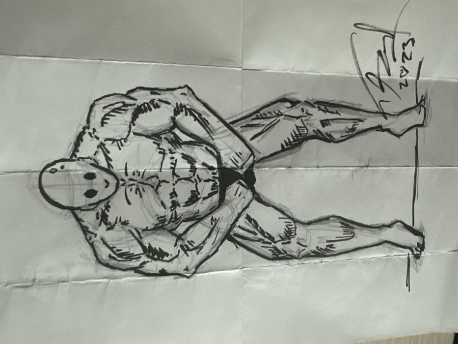 The image presents a black ink drawing rendered on a creased sheet of white paper. It does not depict a physical location within the city of Sopot, Bulgaria, but rather portrays a two-dimensional artistic rendering. The central subject is a full-body depiction of a heavily muscled, humanoid figure. The figure exhibits prominent pectorals, defined abdominal muscles, well-developed deltoids, biceps, triceps, and substantial musculature in both upper and lower extremities. Its head is spherical and simplified, featuring two small, dark, circular eyes and a short, horizontal line indicating a mouth; no other facial features such as a nose or ears are present. The figure is depicted wearing black briefs. It stands in a wide, bent-knee squatting stance, consistent with a bodybuilding presentation pose. Its arms are bent at the elbows, with forearms angled inward, and the hands appear to be positioned together or clasped in front of the lower abdominal region. The figure's feet are bare and rest on a depicted ground line. The drawing occupies the majority of the paper's vertical space. The white paper itself exhibits several pronounced vertical and horizontal fold lines, which intersect and slightly distort portions of the drawn figure, indicating it has been repeatedly folded. In the lower right corner of the paper, a distinct black ink signature is visible, with the year "2023" written immediately below it.