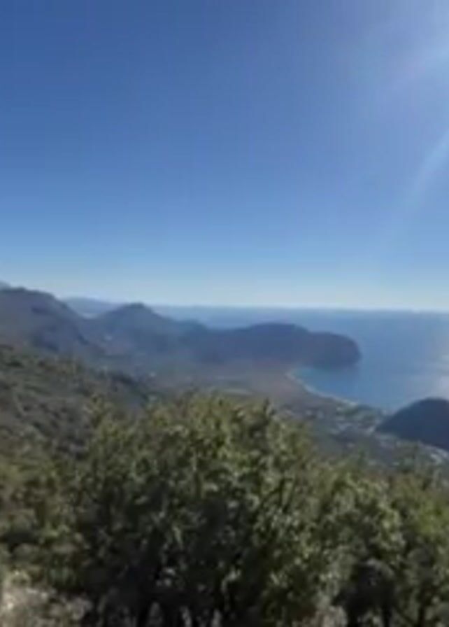 scenic view of a mountainous landscape meeting the sea under a clear blue sky. The sun is shining brightly, creating a glare in the upper right corner of the frame. Green trees fill the foreground, partially obscuring the view of the valley and coastline. Hills and mountains stretch across the midground, leading towards a body of water that reflects the sunlight. The sky is cloudless and blue.