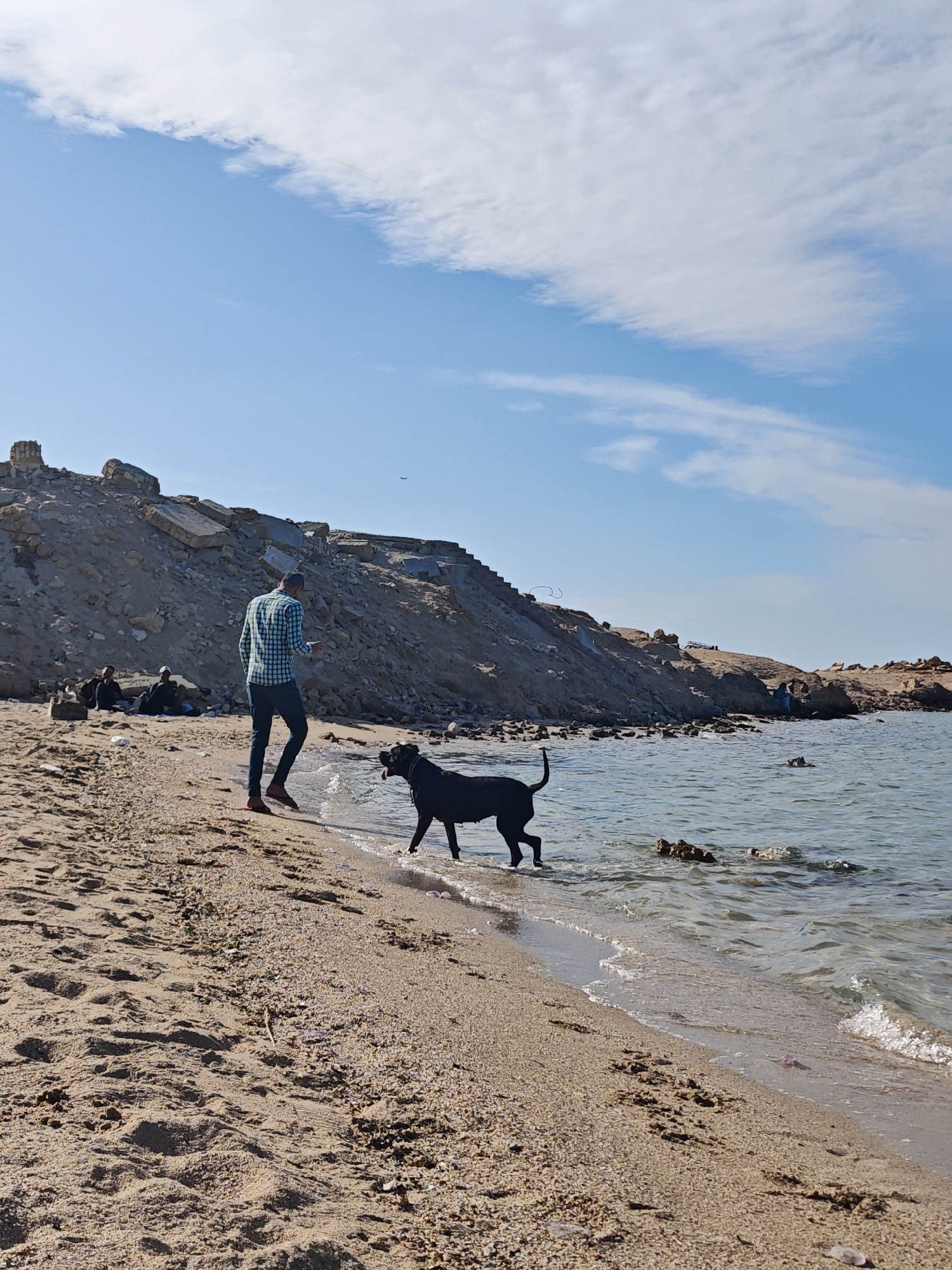 The image depicts a sandy beach scene in Al Ahia', Egypt, under a clear blue sky with scattered white clouds. In the mid-ground, a male individual, seen from behind, walks barefoot in shallow water along the shoreline. He wears a light-colored plaid shirt and dark trousers. To his right and slightly ahead, a large, dark-colored dog walks partially submerged in the water, looking back towards the man with its tongue extended. The foreground consists of light brown, textured sand with visible footprints and small shell fragments. The water, a light blue-green, gently laps the shore, with small waves breaking. Several translucent, reddish-purple objects, possibly jellyfish or plastic debris, are visible in the shallow water and at the waterline, alongside darker, irregular submerged objects. In the background, a large, light-brown sandy hill or cliff dominates, showing signs of erosion and covered with numerous rocks and irregularly shaped concrete or rock debris. Structures or ruins are visible at the upper left peak of this hill. Along the base of the hill to the left, three indistinct individuals are seated or lounging on the sand. Further to the right along the coastline, additional rocky outcrops meet the water, with at least one more distant individual barely discernible near the rocks. A faint dark speckt, likely a distant aircraft, is visible in the upper right sky.