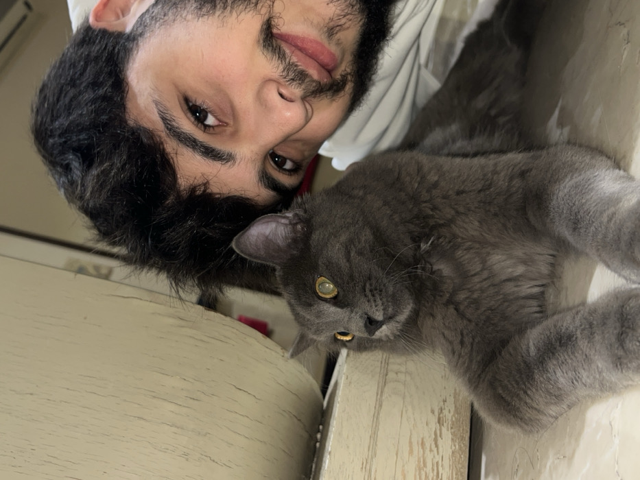 A selfie features a person with dark hair and beard, lying on their side. Their face is close to the camera, showing brown eyes and neutral expression. Next to them is a grey cat with golden eyes. The cat's fur appears long and fluffy. The background consists of a textured, light-colored surface with vertical lines, possibly a wall or furniture. The image is shot from an unusual angle, tilted sideways, giving a unique perspective.