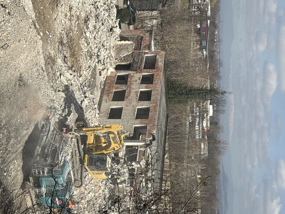 The image depicts a demolition site in the city of Pazardzhik, Bulgaria, under a partly cloudy sky with visible distant snow-capped mountains on the horizon