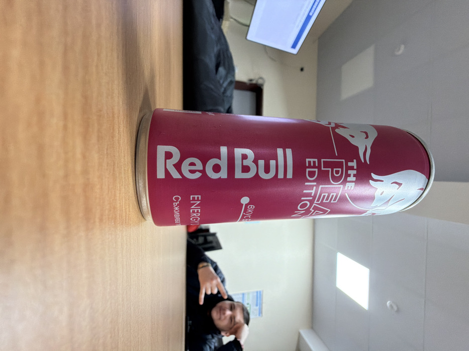 The image displays an indoor scene, identified as being in the city of Dobrich, Bulgaria. In the immediate foreground, a magenta-colored Red Bull "The Peach Edition" energy drink can stands upright on a light brown wooden table surface. The can features white text including "Red Bull", "THE PEACH EDITION", "ENERGY", and the Bulgarian word "Съживява" (Revitalizes), alongside a partially visible "вкус" (taste) indicator. The base of the can is silver. In the blurred background, a male individual with short dark hair is partially visible, positioned behind the table. He is wearing a dark-colored top and exhibits a "rock on" hand gesture with his left hand, while his right hand rests near his head. To the left, a flat-screen monitor displays a blue background with white text, suggestive of a user interface. The background environment includes additional dark-colored furniture, a white ceiling with a single brightly illuminated rectangular fluorescent light fixture, and a white wall with a document or poster attached. There is no depicted interaction between the individual and the can.