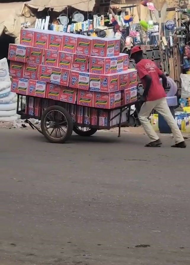 - "A man in a red shirt, white pants, and a red baseball cap is pushing a two-wheeled cart heavily loaded with boxes of Indomie noodles" by FM-hCNc03, licensed under CC BY 4.0