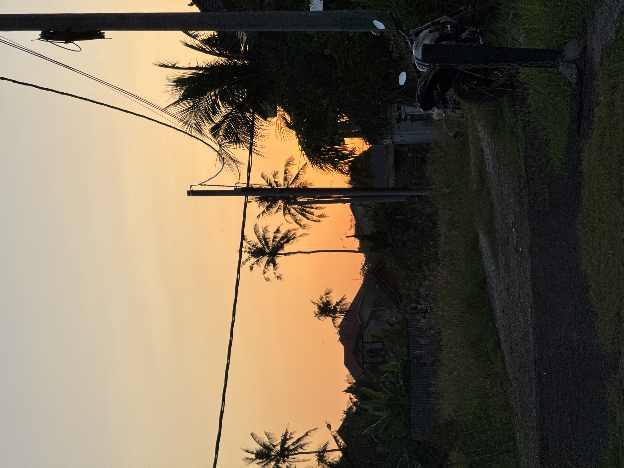 Captured in Ubud District, Indonesia, the image depicts a tranquil scene at dusk. Silhouetted coconut palm trees stand against a vibrant orange and yellow sky, indicative of a sunset or sunrise. Electrical poles and wires traverse the sky, adding a modern element to the tropical landscape. A motorbike is parked alongside a narrow road or path lined with vegetation. A house can be seen in the background. The scene is indicative of a rural or semi-rural setting within the Ubud District.