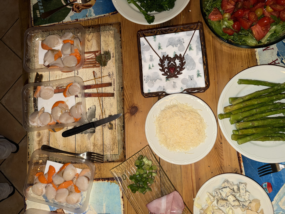 A table displays various ingredients for a meal. Three containers of scallops are present, along with chopped green onions and sliced ham on a glass plate. Adjacent to those are plates of shredded cheese, asparagus, and blue cheese. A large bowl of salad sits next to a plate of broccoli. A decorative napkin holder with a polar bear design completes the scene.