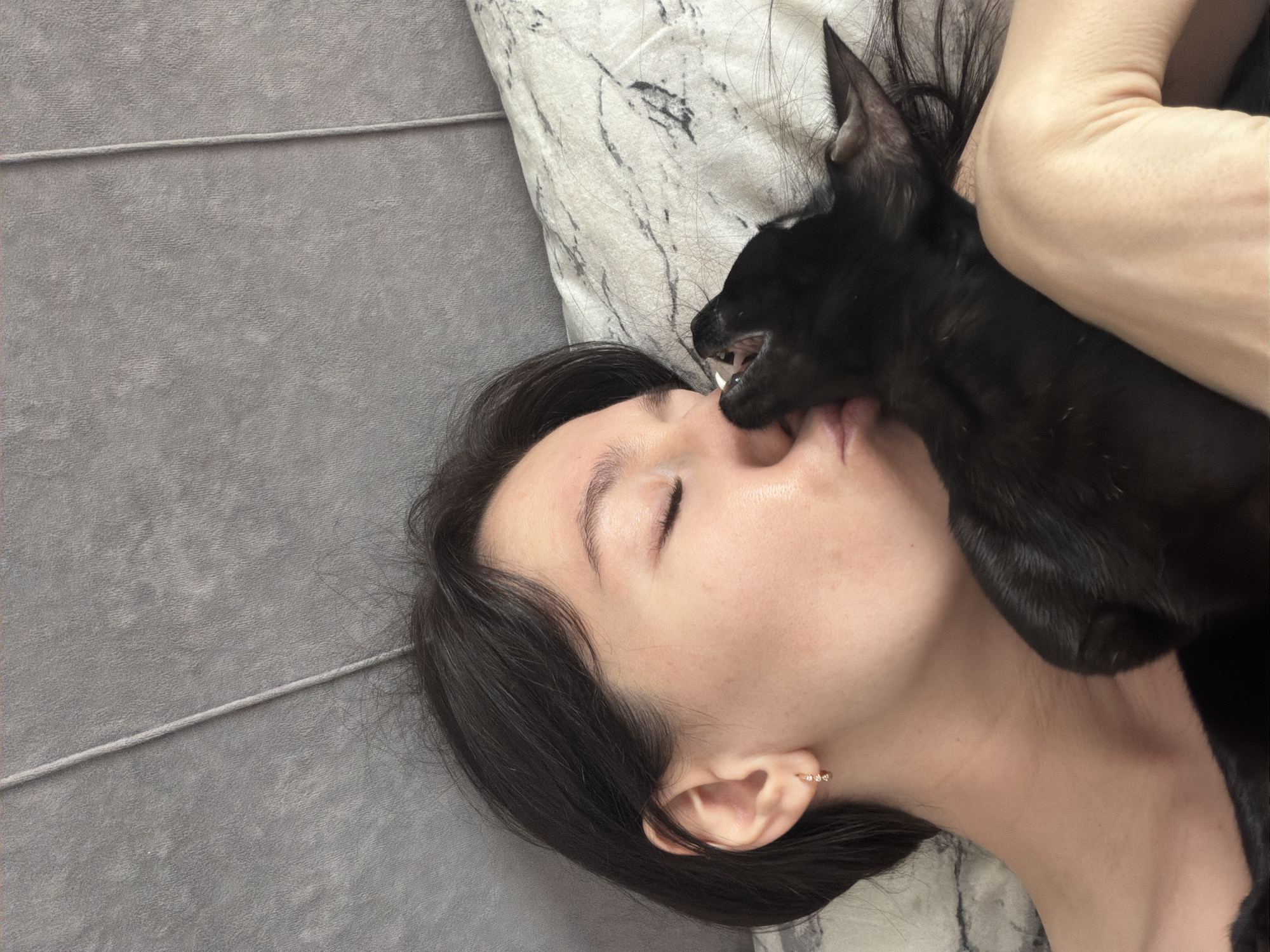 A woman with dark hair lies on a gray upholstered surface next to a pillow with a marble-like pattern. Her eyes are closed. A black cat is positioned on her, with its mouth open near her face, showing its teeth. An arm is also visible in the frame. The location is not discernible as Chaikovsky, Russia, from the image.